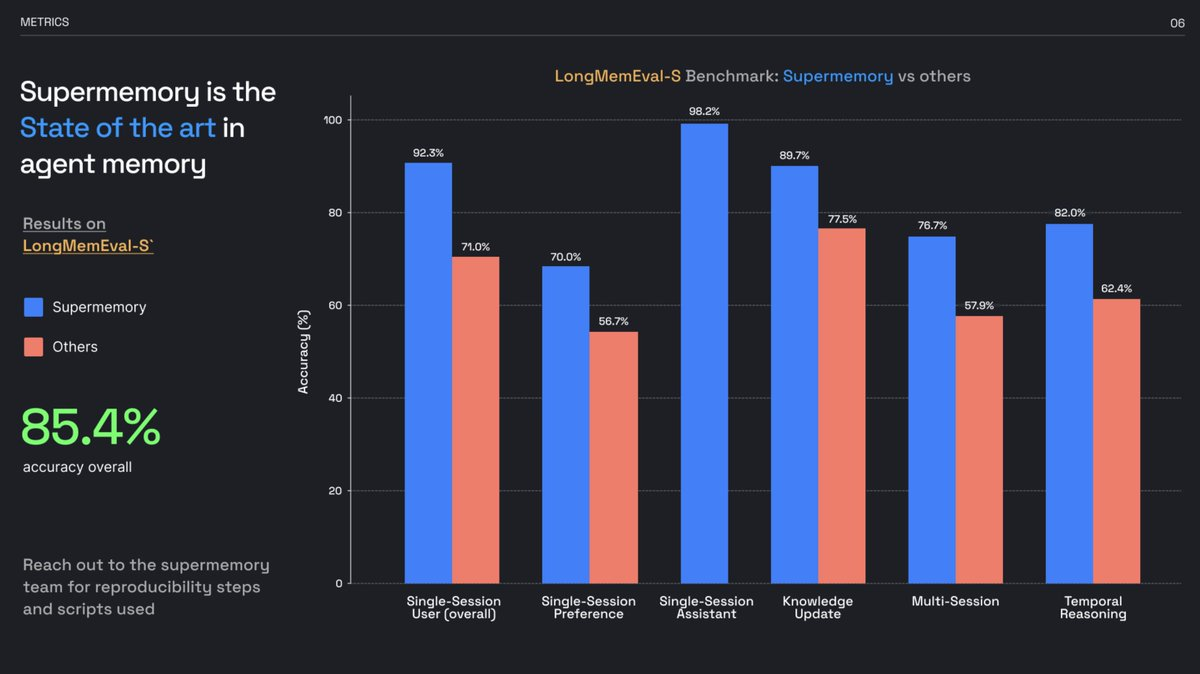 Most "memory" solutions for AI are just RAG—retrieve some similar documents and stuff them in the context. That works for knowledge bases. It doesn't work for memory.Memory isn't just "find similar stuff." It's understanding that when you say "the auth bug," you mean the specific issue you've been debugging for three days. It's knowing that your preferences have evolved—you used to like classes, now you prefer functions. It's tracking that a decision was made, then revisited, then changed.We built a system that actually extracts facts, tracks how they change over time, builds a profile of you that's always current, and retrieves the right context at the right moment. Not just similar context—relevant context.The benchmark we use for this (LongMemEval) puts us at 81.6%. For comparison, most RAG systems score in the 40-60% range on memory-specific tasks.