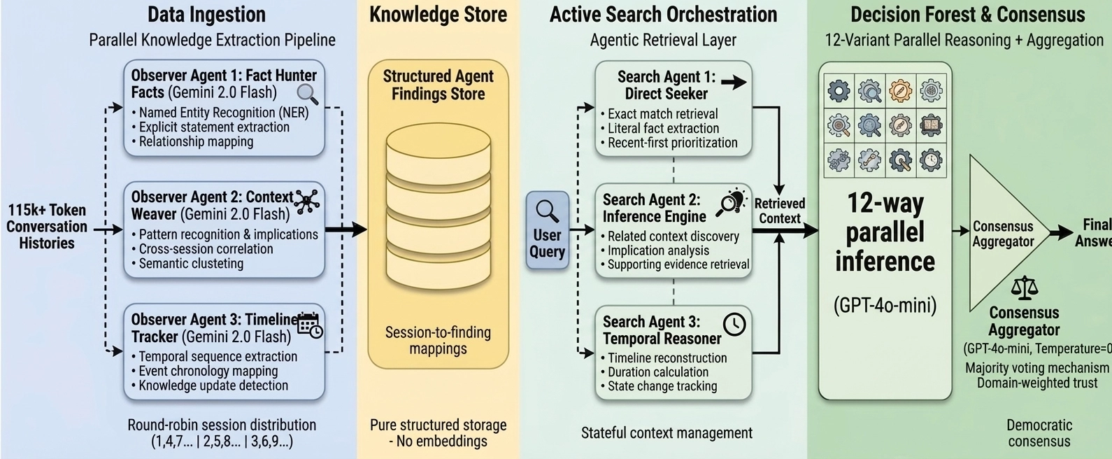 Instead of chunking and embedding user sessions, we deployed an agent orchestrator utilizing 3 parallel reader (observer) agents (powered by Gemini 2.0 Flash). These agents read through raw sessions concurrently (e.g., Agent 1 takes sessions 1, 3, 5; Agent 2 takes 2, 4, 6).