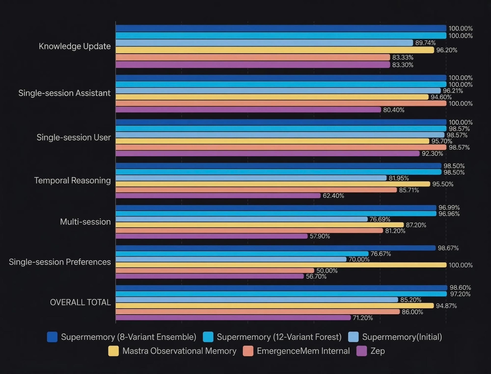 A few months ago, we published our first research report showing Supermemory achieving ~85% on LongMemEval-s result that put us ahead of every publicly benchmarked memory system at the time. Today, we're publishing a new result: ~99% on LongMemEval_s.